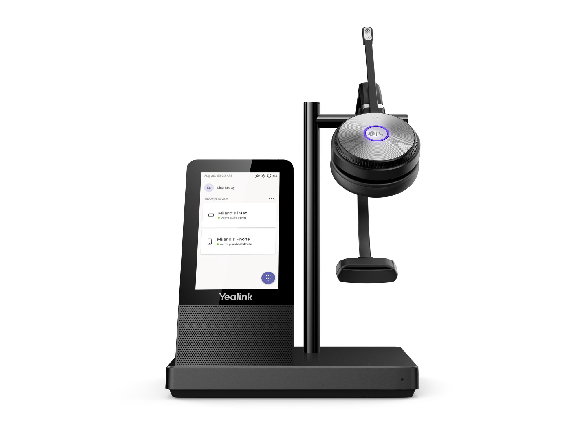 Базовая станция гарнитуры обладает сенсорным дисплеем 4'' с разрешением 480x800 пикселей, встроенным спикерфоном, беспроводной зарядной подставкой для смартфона (опционально).